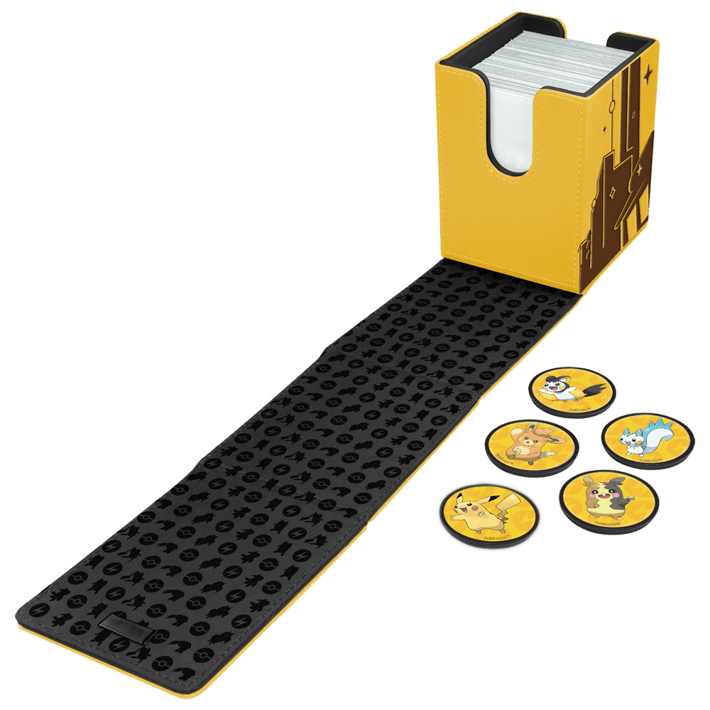 Collect, store, and personalize with the Alcove Click for Pokemon! The Alcove Click comes with four themed badges. This Deck Box holds up to 100 standard size trading cards double-sleeved in Ultra PRO Deck Protector sleeves, features a strong magnetic closure, and has dual thumb notches for easy access to your deck. Personalize your Alcove Click by popping on your favorite magnetic badges and replacing them with other badges. Badges have a 1.5 in. diameter.